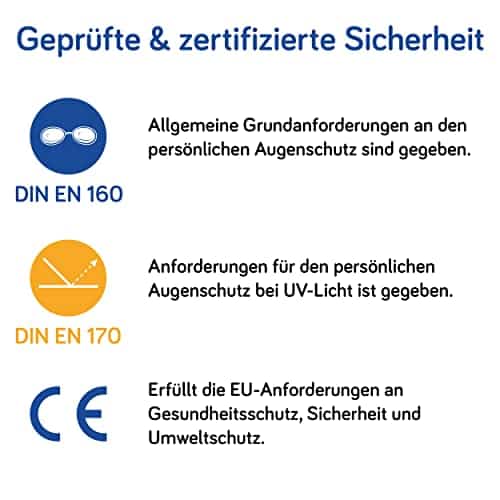 • ☼ZERTIFIZIERTE SICHERHEIT: Die UV-Brille „Made in Germany“ erfüllt alle EU-weiten Standards an Sicherheit & Gesundheitsschutz dank CE-Zertifizierung & offizieller Augenschutz-Prüfung des PFI gemäß DIN EN 170.